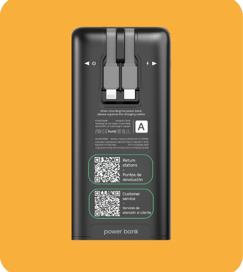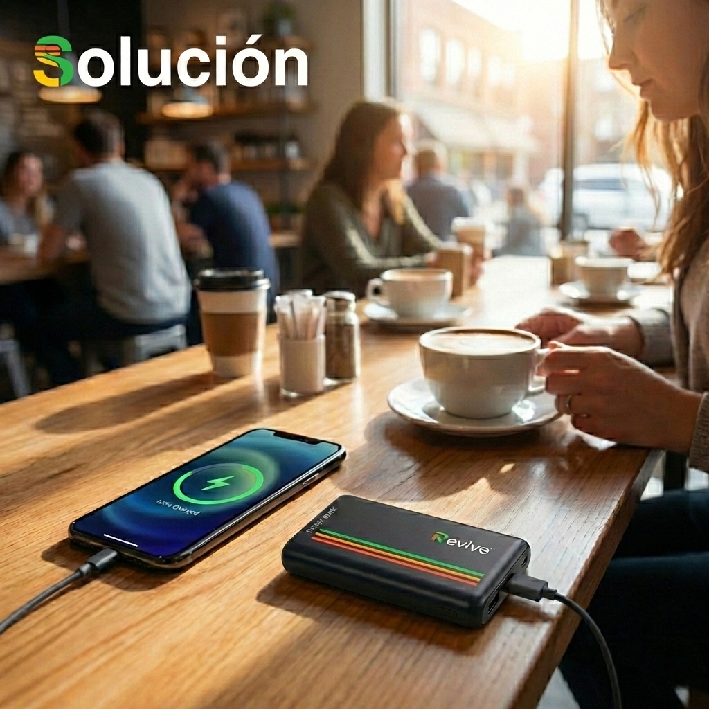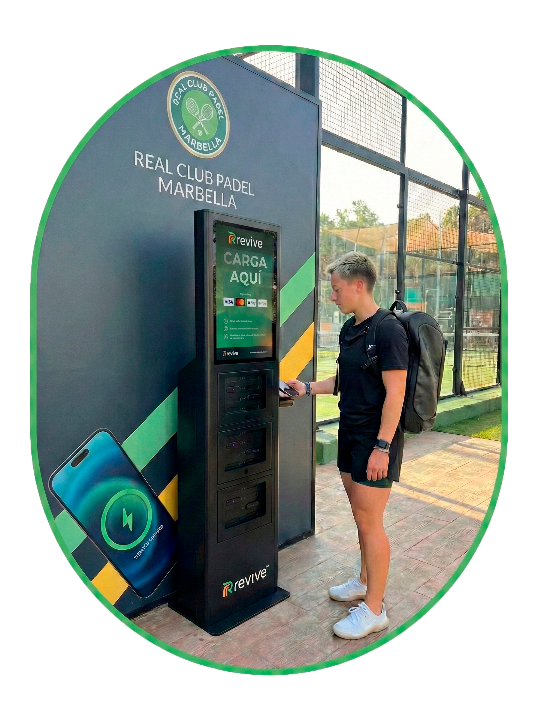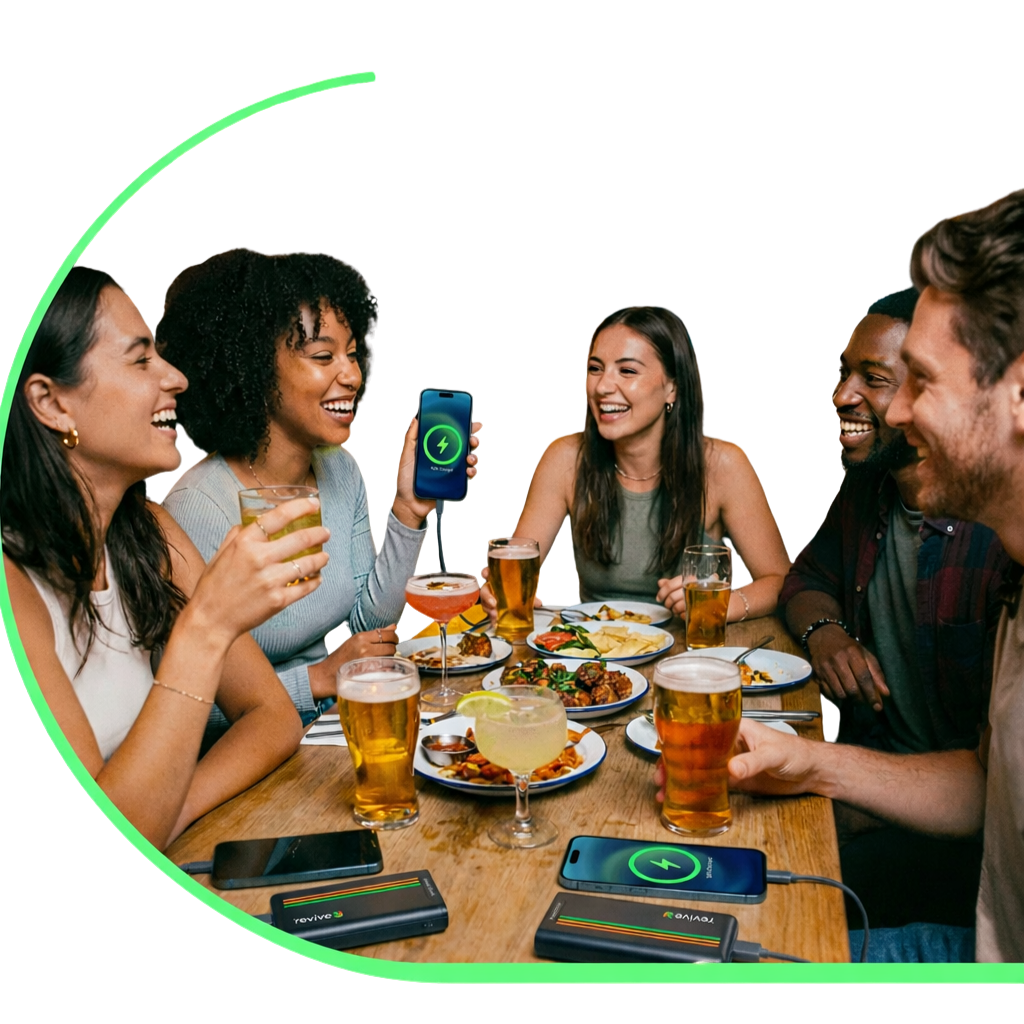 Revive instala en tu local una estación de carga. Tus clientes alquilan una batería portátil, cargan su teléfono mientras disfrutan de tu negocio y la devuelven al finalizar.